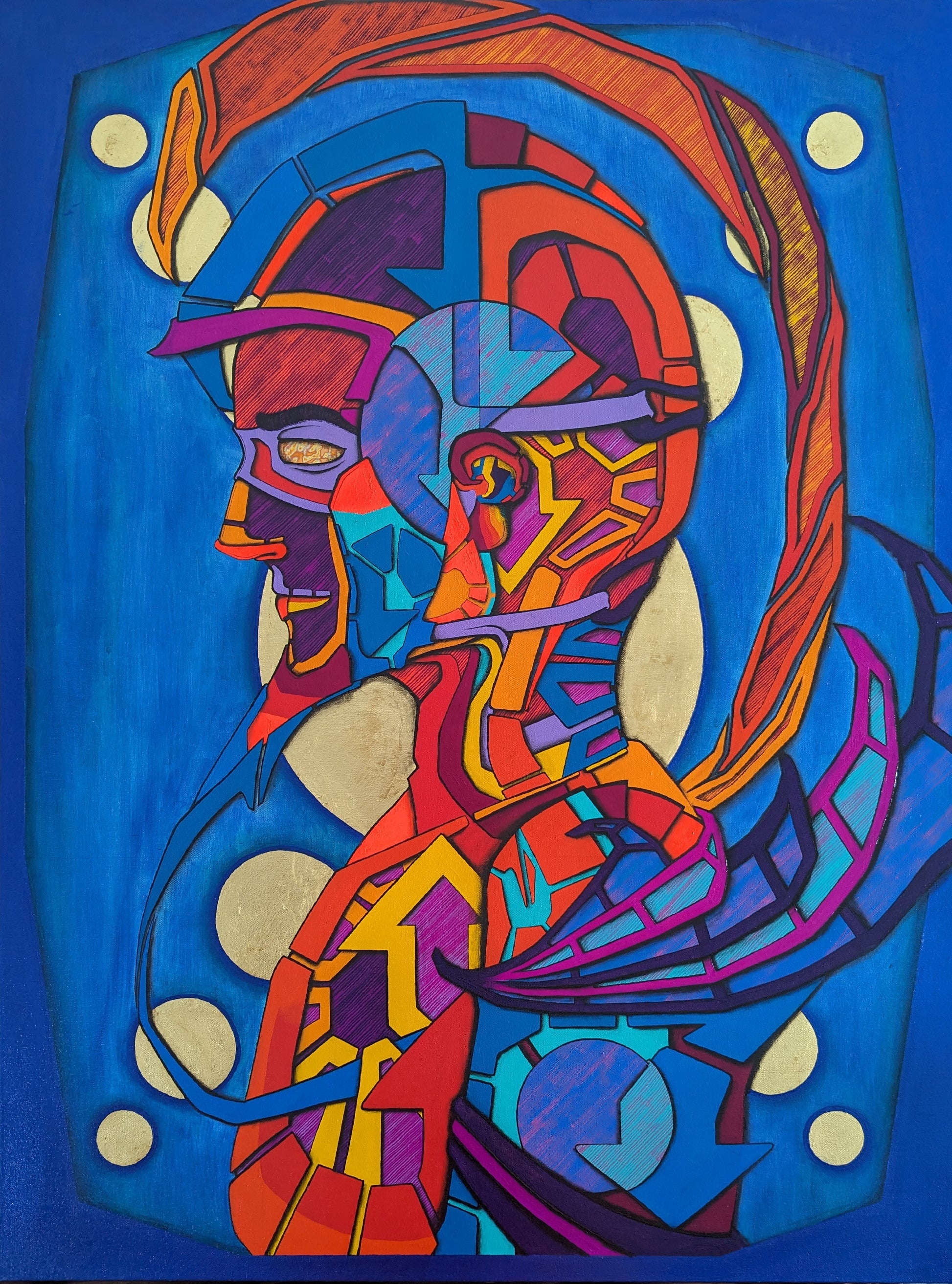 "This painting is part of a creative exploration into utilizing forms and shapes present in my past artwork and graffiti and utilize these forms & shapes as a sort of visual vocabulary. With this vocabulary I seek to create my own interpretations of subjects, initially I have focused on humanoid type subjects and the multiple forms an shapes creates a somewhat segmented look which can perhaps be percieved as robotic, the subjects do seem to embody a futuristic aesthetic. Using multiple colors creates a vivid subject to explore, the use of gold leaf adds a touch of shimmer and brings in a different material to work with alongside the acrylic medium. This is part of the Future Ancestors body of work".