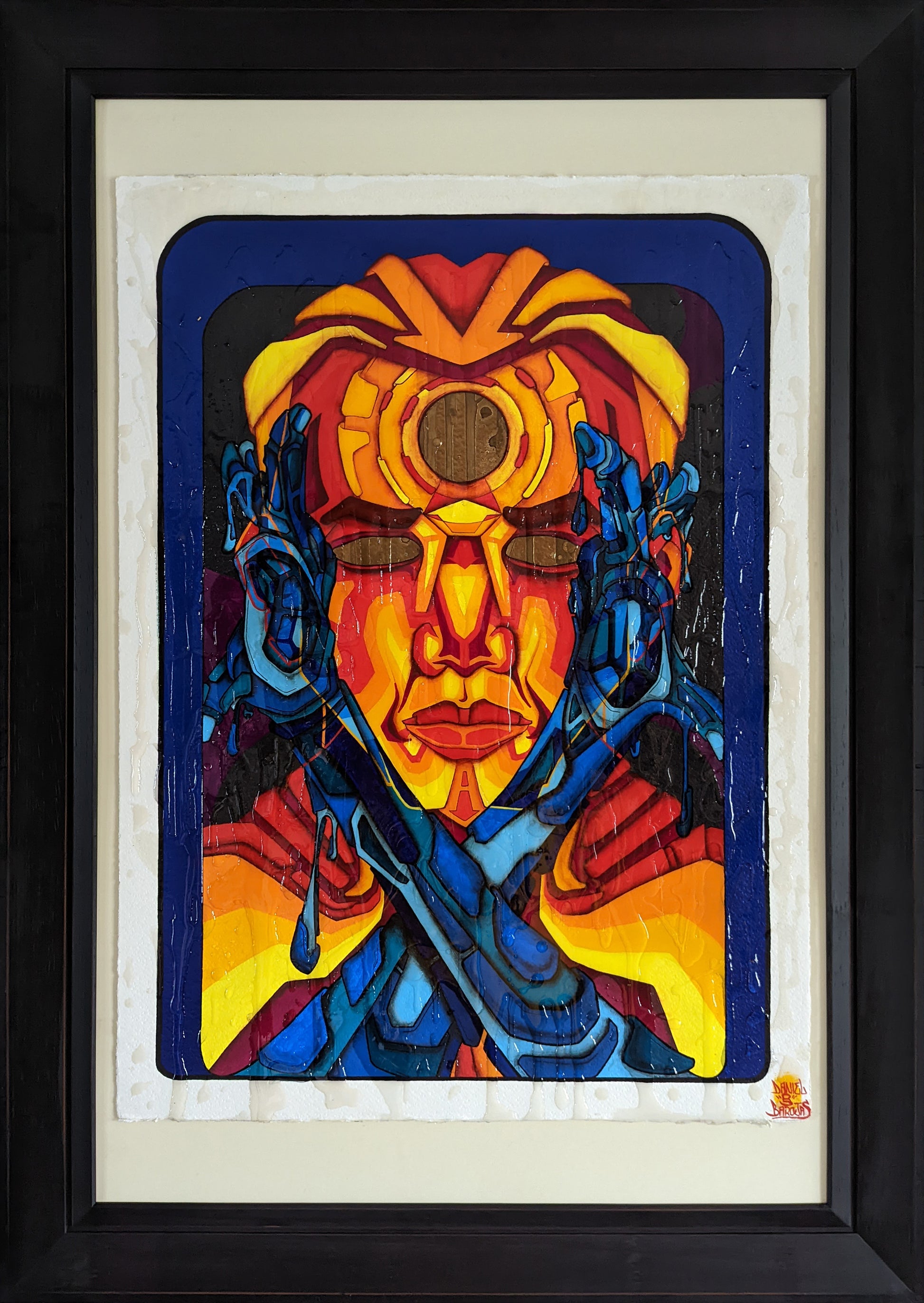 "This painting is part of a creative exploration into utilizing forms and shapes present in my past artwork and graffiti and utilize these forms & shapes as a sort of visual vocabulary. With this vocabulary I seek to create my own interpretations of subjects, initially I have focused on humanoid type subjects and the multiple forms an shapes creates a somewhat segmented look which can perhaps be percieved as robotic, the subjects do seem to embody a futuristic aesthetic. Using multiple colors creates a vivid subject to explore, the use of gold leaf adds a touch of shimmer and brings in a different material to work with alongside the acrylic medium. This is part of the Future Ancestors body of work".