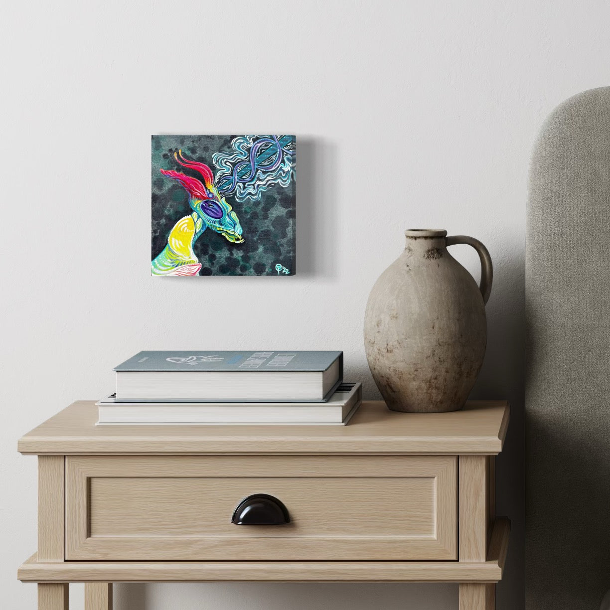 Experience the thrill of the Devil's Flower Mantis with this 8x8" acrylic on gallery wrapped canvas. Adorned with a 5mm Moonstone cabochon on its crown Chakra, this piece embodies boldness and daring.