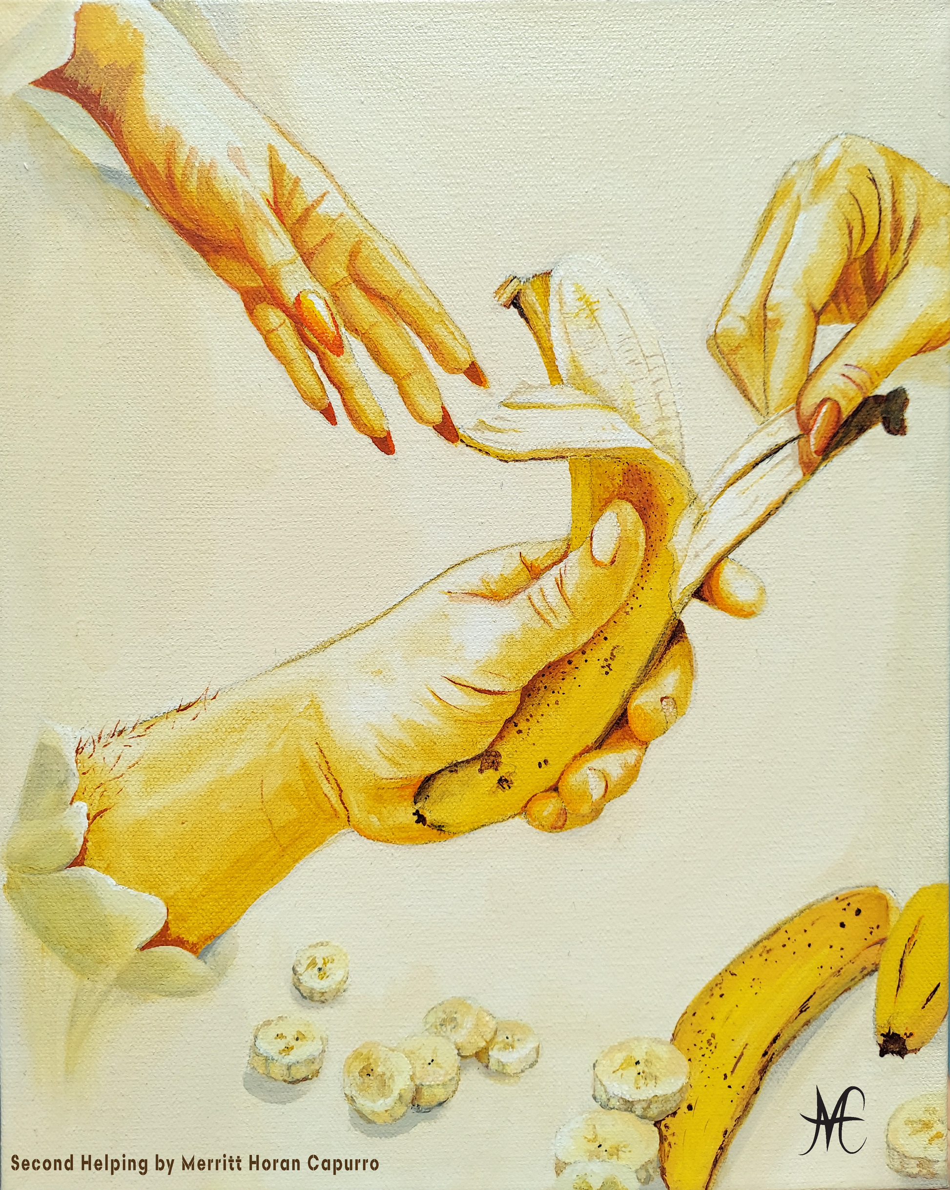 Sometimes we crave more. Why stay satisfied when I'm still ravenous? This Depicts the sweet gluttony of allowing oneself a second. The first course being spent on the ground while two hands reach for a second helping, indeed.