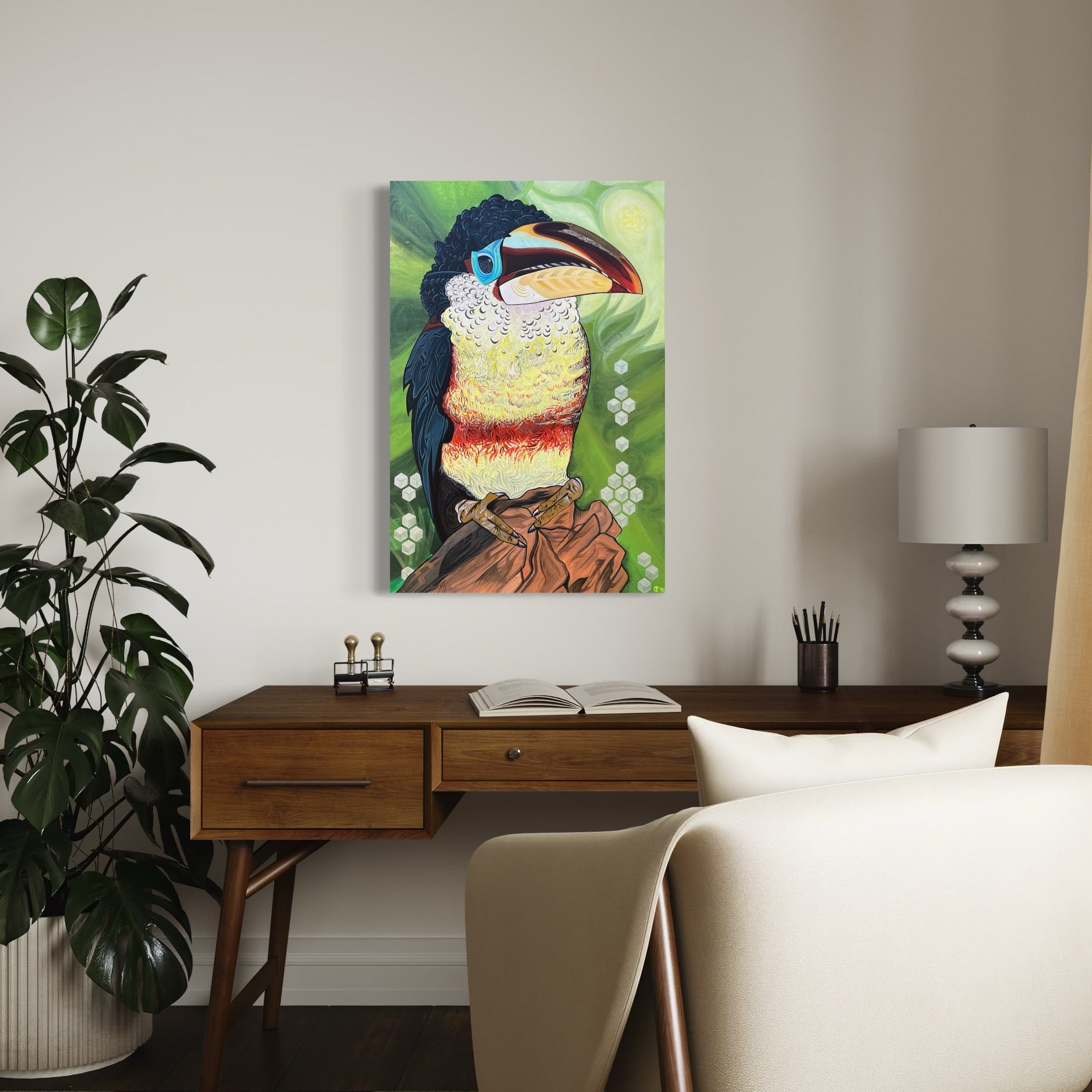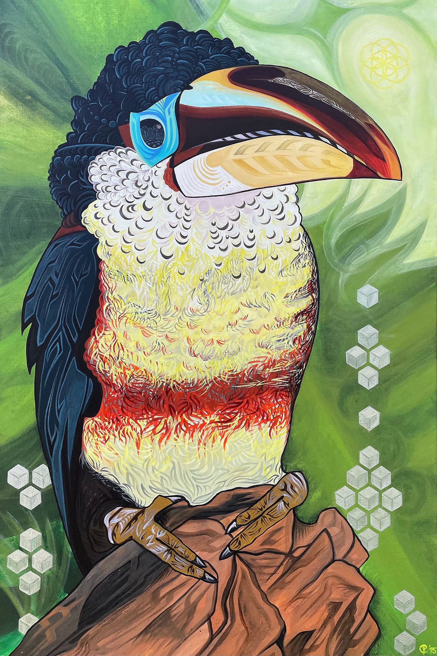 A 24x36" acrylic on canvas portraying a South American Red Billed Toucan gazing upon a section of rainforest that has been cleared, as depicted in the shine of his eye. Showcasing a silver coil that adds a glimmer to his eye.